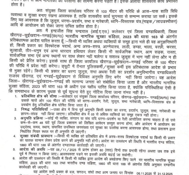 CG News : अनादि न्यूज़ डॉट कॉम , . खैरागढ़–छुईखदान–गंडई जिले में प्रशासन ने सार्वजनिक व्यवस्था और सरकारी कामकाज को प्रभावित होने से रोकने के लिए बड़ा फैसला लिया है. कलेक्टर और जिला दंडाधिकारी इन्द्रजीत चंद्रवाल ने भारतीय नागरिक सुरक्षा संहिता, 2023 की धारा 163 के तहत आदेश जारी करते हुए कलेक्ट्रेट परिसर के 100 मीटर के दायरे को पूरी तरह “शांति क्षेत्र” घोषित कर दिया है. अब इस क्षेत्र में धरना, प्रदर्शन, जुलूस, नारेबाजी और लाउडस्पीकर का उपयोग नहीं किया जा सकेगा.