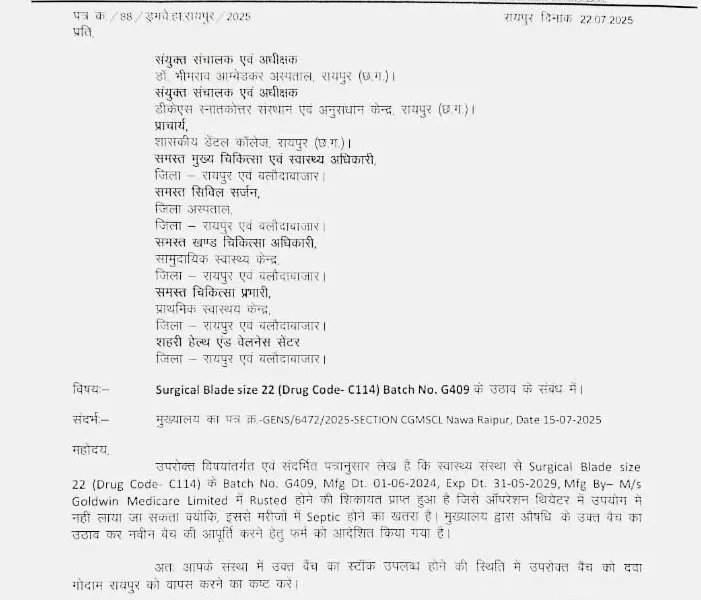 निगम के स्टोर आफिसर ने 22 जुलाई को अंबेडकर अस्पताल, डीकेएस सुपर स्पेशलिटी हॉस्पिटल, प्राचार्य डेंटल कॉलेज समस्त मुख्य चिकित्सा स्वास्थ्य अधिकारी, सिविल सर्जन 100 चिकित्सा अधिकारी शहरी हेल्थ और वैलनेस सेंटर और चिकित्सा प्रभारी प्राथमिक स्वास्थ्य केंद्र रायपुर बलौदा बाजार को भी यह आदेश जारी किया है।