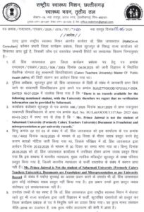 अनादि न्यूज़ डॉट कॉम, रायपुर। राष्ट्रीय स्वास्थ्य मिशन संचालक सह आयुक्त ने सुरजपुर के प्रभारी जिला कार्यक्रम प्रबंधक डा प्रिंस जायसवाल की संविदा सेवा समाप्त कर दिया है। उसने फर्जी कूटरचित प्रमाण पत्र के जरिए नियुक्ति हासिल की थी। उसने साबरमती विश्वविद्यालय के प्रमाण पत्र संलग्न कर आवेदन दिया था।