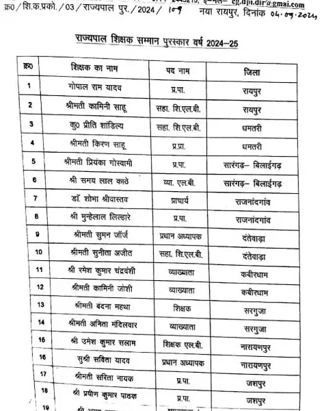 अनादि न्यूज़ डॉट कॉम, रायपुर। प्रदेश 64 शिक्षकों को शिक्षक दिवस के मौके पर राज्यपाल रामेन डेका सम्मानित करेंगे। पुरस्कार प्राप्त शिक्षकों के नाम इस प्रकार है।