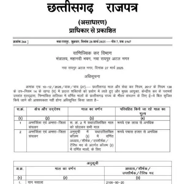 अनादि न्यूज़ डॉट कॉम, रायपुर। छत्तीसगढ़ सरकार ने व्यापारियों को बड़ी राहत देते हुए 1 लाख तक के सामान की ट्रांसपोर्टिंग में ईवे बिल में छूट दी है। इस संबंध में आज नोटिफिकेशन जारी किया गया है।जो कल एक अप्रैल से लागू हो जाएगा। नोटिफिकेशन में बताया गया कि पान मसाला, तम्बाकू और तम्बाकू उत्पाद, विनियरिंग शीट्स, लेमिनेटेड शीट, पार्टिकल बोर्ड, फाइबर बोर्ड, प्लाईवुड, आयरन एंड स्टील, आयरन एंड स्टील के सामान और कोयला को 50 हजार रुपए की श्रेणी में रखा गया है।इसके अलावा अन्य सामान की ट्रांसपोर्टिंग 1 लाख रुपए से अधिक होने पर ई वे बिल देना पड़ेगा।