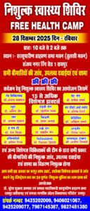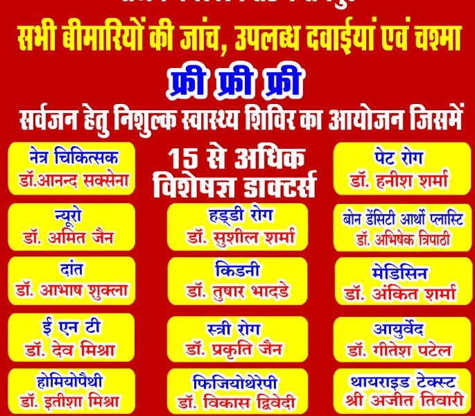 रायपुर में 28 दिसंबर को निःशुल्क स्वास्थ्य शिविर, 15 से अधिक विशेषज्ञ डॉक्टर देंगे सेवाएं
