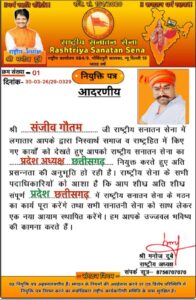 राष्ट्रीय सनातन सेना छत्तीसगढ़ में संगठन विस्तार, संजीव कुमार गौतम पुनः बने प्रदेश प्रमुख