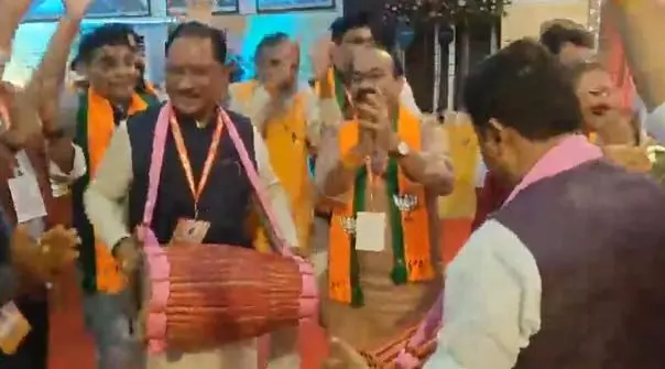अनादि न्यूज़ डॉट कॉम, मैनपाट। बीजेपी द्वारा मैनपाट में आयोजित प्रशिक्षण शिविर का एक ताजा वीडियो वायरल हो रहा है, जिसमें मुख्यमंत्री विष्णुदेव साय और छत्तीसगढ़ बीजेपी के प्रभारी नीतिन नबीन ढोलक बजा रहे हैं, डिप्टी सीएम , केंद्रीय राज्य मंत्री , सांसद, विधायक सब नाच रहें है।