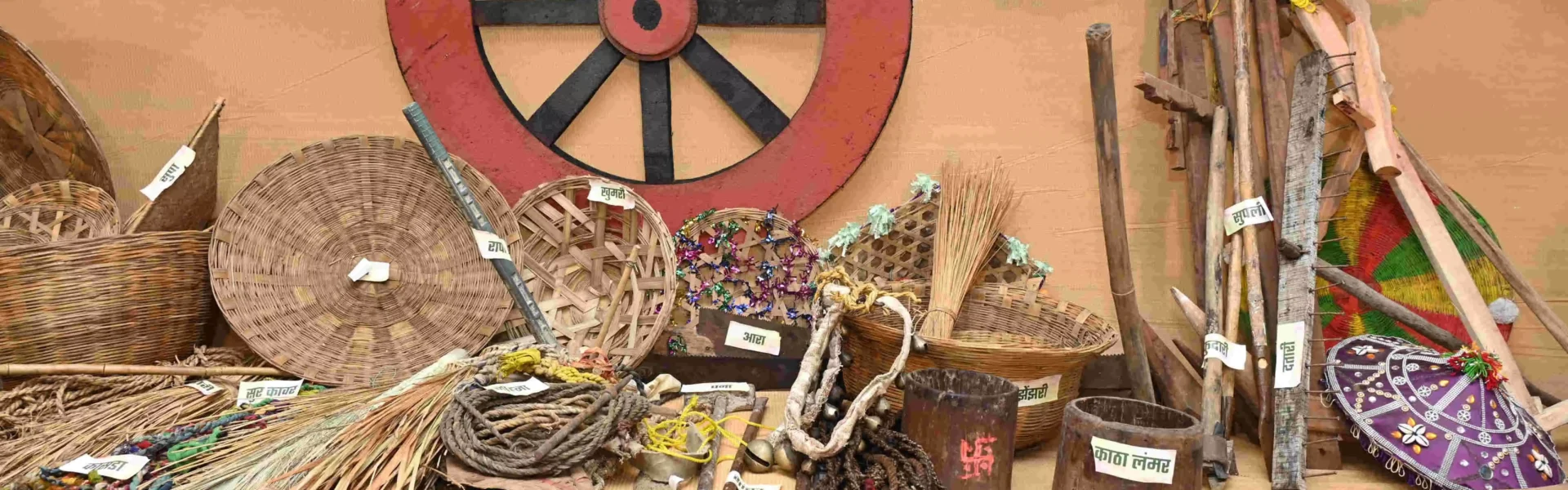 सबसे बाईं ओर दो गोलनुमा लकड़ी की संरचनाएँ रखी गई थीं, जिन्हें ‘काठा’ कहा जाता है। पुराने समय में जब गाँवों में धान तौलने के लिए काँटा-बाँट प्रचलन में नहीं था, तब काठा से ही धान मापा जाता था। सामान्यतः एक काठा में लगभग चार किलो धान आता है। काठा से ही धान नाप कर मजदूरी के रूप में भुगतान किया जाता था।
