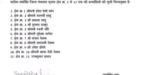 कांग्रेस ने गरियाबंद जिला पंचायत के लिए सदस्य प्रत्याशियों के नाम घोषित किए