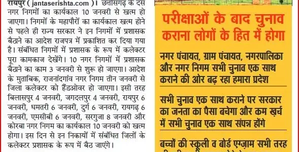 अनादि न्यूज़ डॉट कॉम, रायपुर। छत्तीसगढ़ के दस नगर निगमों का कार्यकाल 10 जनवरी से खत्म हो जाएगा। निगमों के महापौरों का कार्यकाल खत्म होने से पहले ही राज्य सरकार ने इन निगमों में प्रशासक बैठाने का आदेश राजपत्र में…