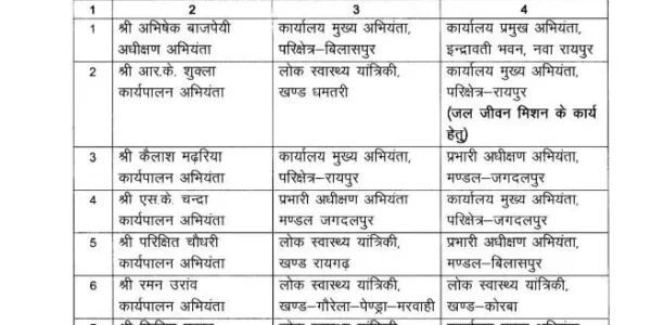 अनादि न्यूज़ डॉट कॉम, रायपुर। लोक स्वास्थ्य यांत्रिकी विभाग पीएचई में 39इंजीनियरों के तबादले किए गए हैं। इनमें 1एसई, 10ईई, 27एई शामिल हैं। इसमें कई जूनियरों को वरिष्ठ पदों का प्रभार दिया गया है।