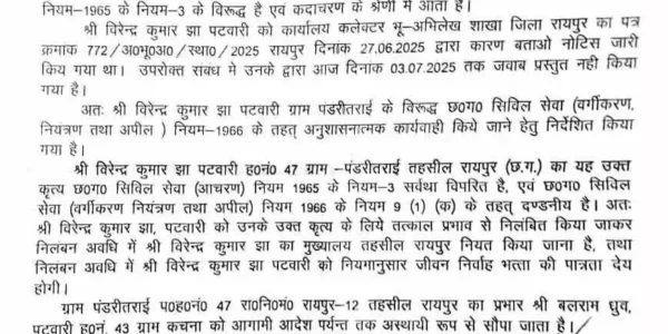 रायपुर SDM की कार्रवाई, पटवारी निलंबित