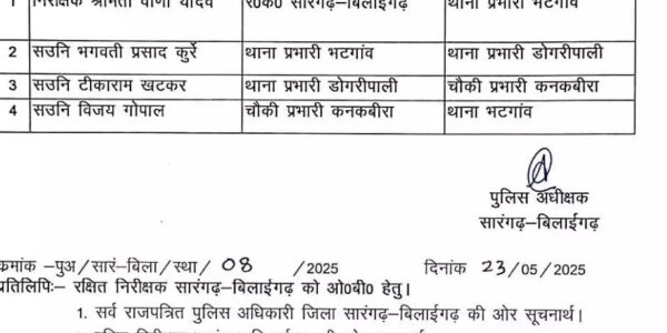 अनादि न्यूज़ डॉट कॉम, सारंगढ़-बिलाईगढ़। जिले के पुलिस विभाग में कसावट लाने के लिए 28 पुलिसकर्मी का तबादला किया है. आरक्षक से लेकर निरीक्षक स्तर के कई पुलिसकर्मी इधर से उधर किए गए हैं. पुलिस अधीक्षक आंजनेय वार्ष्णेय ने इस…
