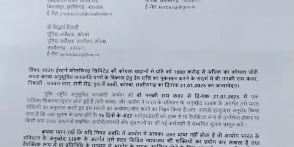 केंद्रीय आयोग ने कोयला चोरी की शिकायत पर लिया एक्शन, एसपी-कलेक्टर को जवाब तलब कर 15 दिनों के भीतर कार्रवाई कर रिपोर्ट मांगी है।