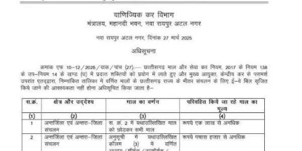 अनादि न्यूज़ डॉट कॉम, रायपुर। छत्तीसगढ़ सरकार ने व्यापारियों को बड़ी राहत देते हुए 1 लाख तक के सामान की ट्रांसपोर्टिंग में ईवे बिल में छूट दी है। इस संबंध में आज नोटिफिकेशन जारी किया गया है।जो कल एक अप्रैल से…